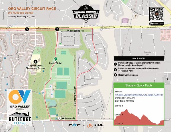 The Oro Valley Circuit Race p/b Rutledge Dental has been reimagined for 2025 with a shorter, more intense course that promises thrilling competition for racers and spectators alike. The 2.8-mile (4.5 km) circuit winds through the breathtaking beauty of Naranja Park, combining challenging climbs, technical descents, and incredible views.