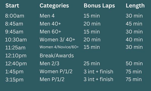 Most race categories will last between 30-75 minutes, with riders completing multiple laps, each featuring 190 feet of climbing. Pro categories begin at 1:45pm.
