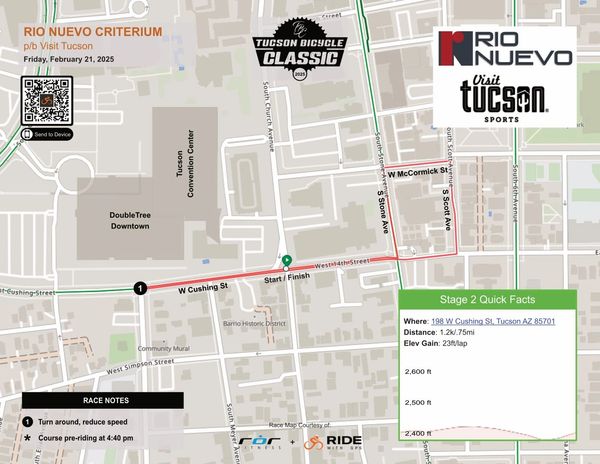 The Rio Nuevo Criterium p/b Visit Tucson will be held on Friday evening in Tucson’s Rio Nuevo district. Races will begin at 5:00pm, and conclude around 9:00pm.